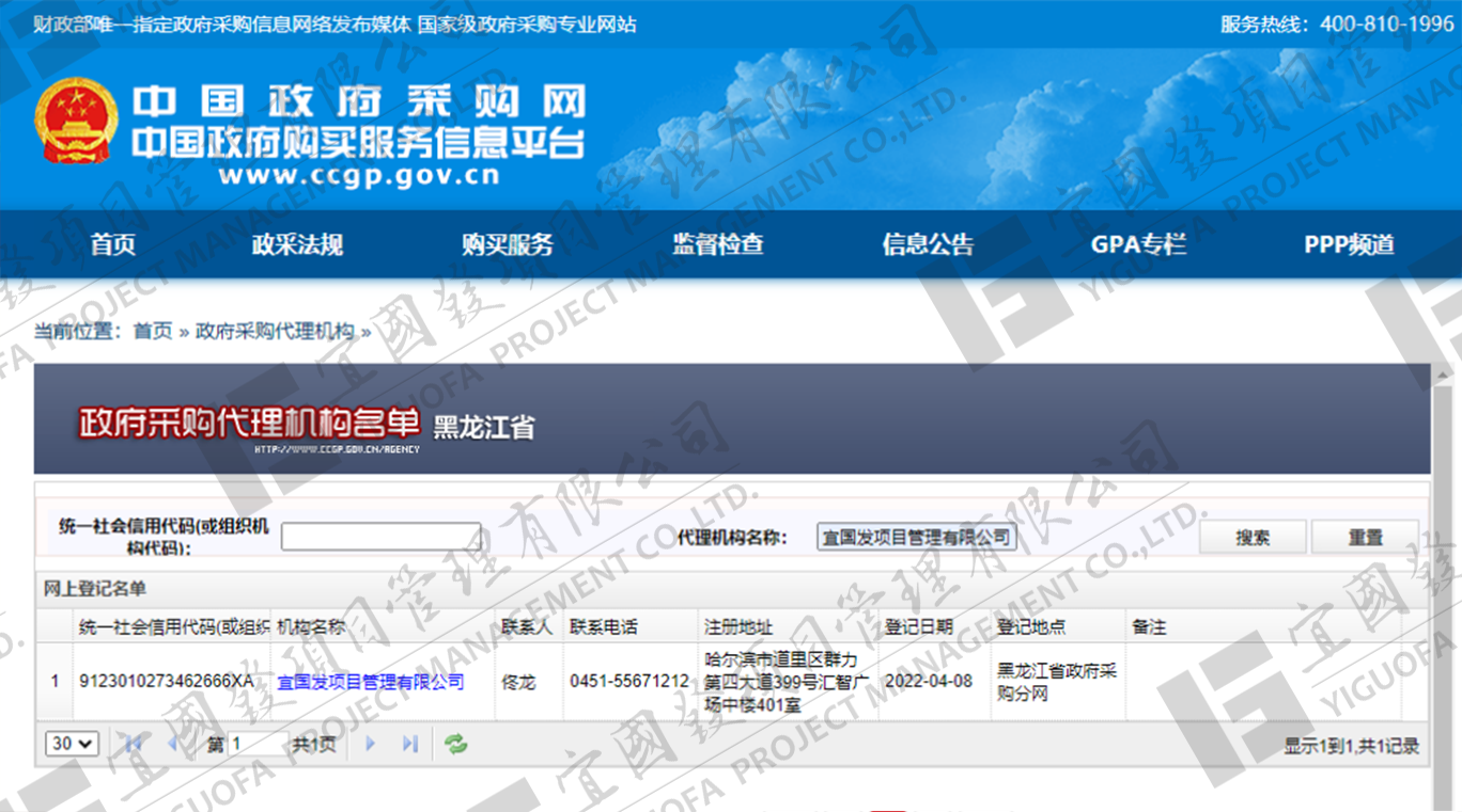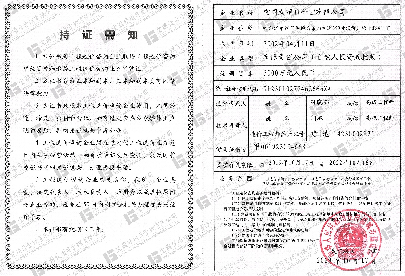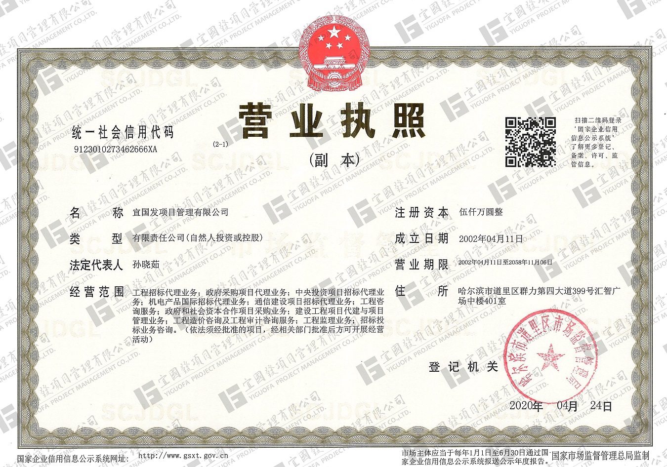 宜國(guó)發(fā)項(xiàng)目管理有限公司(原名黑龍江國(guó)發(fā)項(xiàng)目管理有限責(zé)任公司)成立于2002年4月,公司注冊(cè)資金5000萬(wàn)元人民幣,具有獨(dú)立法人資格。現(xiàn)具備國(guó)家住房和城鄉(xiāng)建設(shè)部頒發(fā)的工程招標(biāo)代理機(jī)構(gòu)甲級(jí)資質(zhì),發(fā)展和改革委員會(huì)頒發(fā)的中央投資項(xiàng)目招標(biāo)代理機(jī)構(gòu)甲級(jí)資質(zhì)、財(cái)政部頒發(fā)的政府采購(gòu)代理機(jī)構(gòu)甲級(jí)資質(zhì),黑龍江省住房和城鄉(xiāng)建設(shè)廳頒發(fā)的工程造價(jià)咨詢(xún)企業(yè)甲級(jí)資質(zhì),并已納入全國(guó)投資項(xiàng)目在線(xiàn)審批監(jiān)管平臺(tái)工程咨詢(xún)單位備案名單、“中國(guó)政府采購(gòu)網(wǎng)”政府采購(gòu)代理機(jī)構(gòu)名單及“中國(guó)國(guó)際招標(biāo)網(wǎng)”機(jī)電產(chǎn)品國(guó)際招標(biāo)代理機(jī)構(gòu)名單,且通過(guò)了質(zhì)量管理體系、環(huán)境管理體系、職業(yè)健康安全管理體系認(rèn)證。